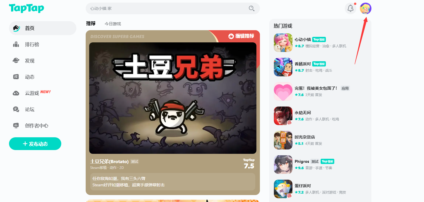 1、进入taptap首页后,点击页面右上方的头像。