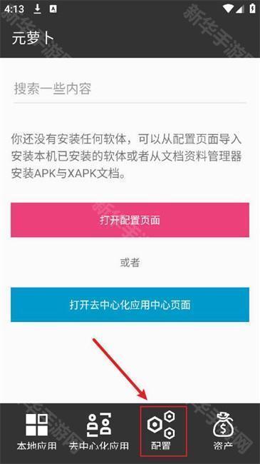 1、打开已下载安装的元萝卜app,在主界面下方点击【配置】图标。