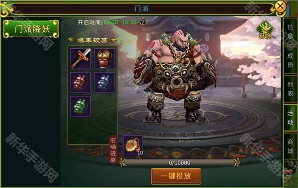 在门派里,我们可以体验有趣的活动玩法-门派降妖,和门派成员一起召唤妖兽,共同击杀获取奖励,也可以在使用“门派贡献”在门派商店里购买物美价廉的道具,还可以组织团建活动等。