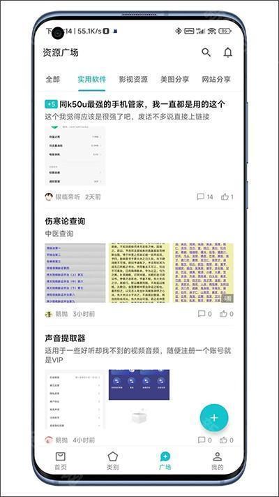3、内置资源广场,用户可以在这里分享各种好用的工具、资源等,还能点赞评论。