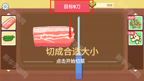 并且不同的食材或配料有着不同的要求,玩家要根据游戏上方的要求,将食材切成相应的数目
