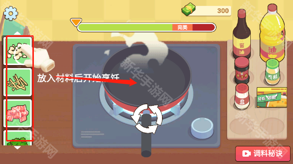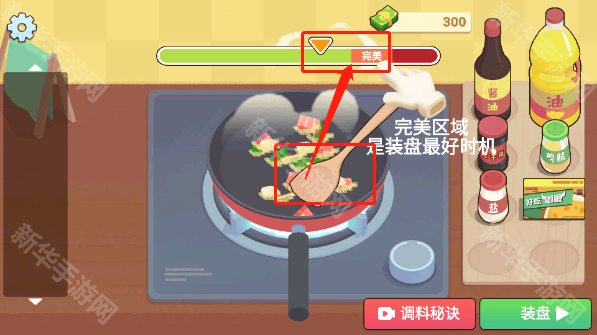 上方槽可查看菜品的烹饪情况,玩家需要将指针控制在“完美”阶段,并且点击屏幕可进行翻炒的操作,可用于加速指针的移动速度,更加快速得获得完美的菜品