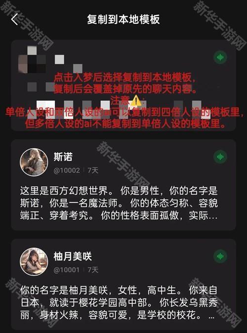 ②点击“入梦”进入,选择复制到本地模板复制到本地模板之后会覆盖掉原模板的聊天内容。单倍人设的AI可以复制到多倍人设的模板里,双倍人设的AI也可以复制到四倍人设的模板里。总之就是AI的人设字数要小于或等于模板的人设上限才行。
