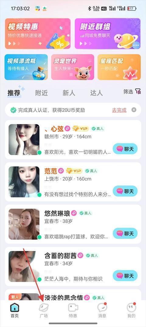 1、打开友趣App,进入主界面后点击底部导航栏中的【广场】;
