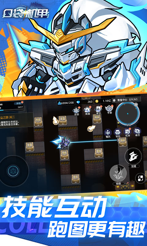 口袋机甲是一款机甲冒险养成游戏,玩家能体验到高清画质下的钢铁洪流碰撞,还能通过自由组合机甲部件,打造独一无二的战争机器。故事设定在22世纪末的废土世界,随着地球资源枯竭,人类分裂为两大阵营——“新联邦”与“自由同盟”,双方为争夺能源展开无尽战争。而机甲技术因一次外星陨石坠落实现突破,成为左右战局的核心力量。玩家扮演的“机甲指挥官”需在废墟中搜集资源、重组机甲,并带领幸存者建立防线,抵御敌对势力的侵袭。