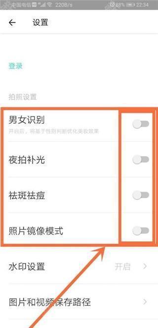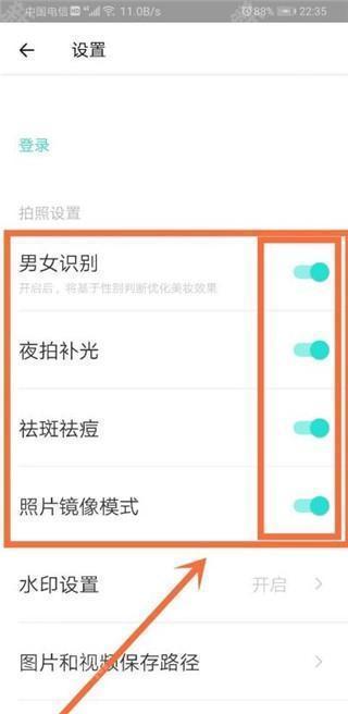 5、进入设置界面后,分别点击【男女识别、夜拍补光、祛斑祛痘和照片镜像模式】后面的【开启按钮】进入。如下图所示