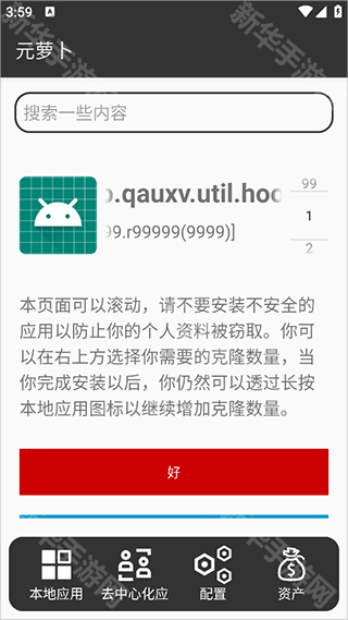 1、首先进入元萝卜虚拟机app中的【配置】页面下点击克隆安装需要注入模块的应用