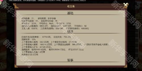 国库主要来源是各地收支,商业负责银两,矿业负责矿石,农业负责粮草,城市等级越高,收入也越高。内库主要来源是自宅产出+国库分成(分成比例占不清楚)-自宅支出-后宫支出-随从支出贸易与帝成差不多,高智力影响下限,高野心影响上限。不同点贸易的成功概率以及贸易需要花钱