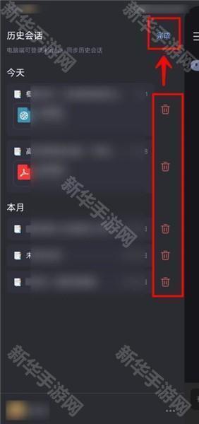 3、然后找到要删除的历史会话,点击右侧的【删除】图标,再点击【完成】即可。