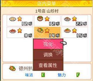 “强化”是另一种增强菜品属性的方式,选择菜单-餐厅菜单-菜品设置-店内菜单,选中希望增强的菜选择“强化”选项。在食材列表中选择消耗一份食材对菜品进行增强,注意强化完成后食材就会消失,所以尽量选择契合度高又有富余的食材来进行强化吧。