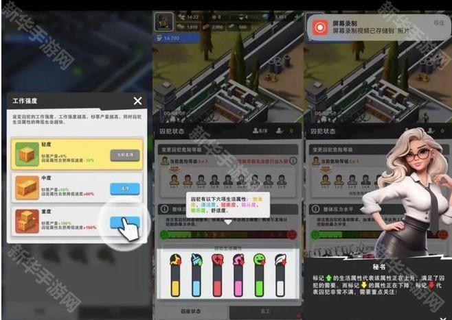 具体来说,除了逐步升级扩大监狱规模之外,玩家想要提高监狱生产效率还有两个比较快捷的手段,一个是颁布强度更高的工作安排,另一个是把接受犯人的危险等级提升,危险等级越高的犯人生产效率也越高,监狱赚钱也更快。不过在没有升级配套建筑的情况下执行这两个操作有很大风险,会导致犯人的6个生活属性出现明显下滑;如果下滑幅度太大,犯人就会开始“闹事”暴乱,导致监狱完全陷入瘫痪。