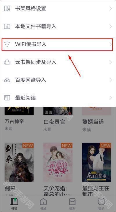 1、当电脑和手机连接同一个WiFi时,打开熊猫app,点击[书架] - [右上角菜单] ;