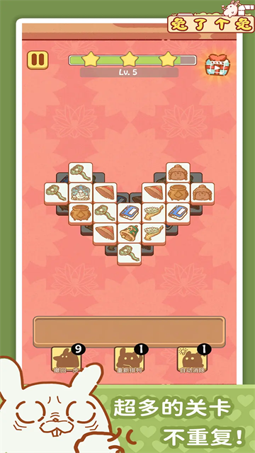 兔了个兔有着经典的卡通画风,以及温馨的日常,治愈的形象和超多可爱的关卡,让人不禁和可爱的兔子们一同冒险。游戏还能在通关后获取更多的奖励,找到最初的快乐,沉浸式的音乐效果,充满感染力的动作,快速进行闯关,自由展开消除,还可以通过道具解锁更多的关卡,体验到更多的东西,有着障碍比较繁琐,需要根据角色的动作找到破解的方法,充满感染力的动作和快速通关的过程,给人带来更多的乐趣。