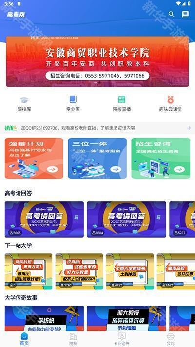 2、在首页我们可以看到院校库、专业库、院校直播、趣味云课堂等功能;