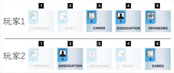 2、速推开局。是否速推主要看对方的反应。在一些情况下(例如下图),玩家1可以【协会】拿5牌->【卡牌】,而玩家2由于被发牌员安排了基本只能【卡牌】->【其它】。第三动如果玩家1直接【赞助】休息5,那么玩家2直接裂开,因为他甚至连一次协会都没有做就被过turn了,同时手牌还超上限了。并且需要注意的是, 这种情况未必少见,因此如果你是这个运气不好的玩家2,那么在喷发牌员的同时要谨慎执行第一次的【卡牌】行动。而对于想要速推的玩家,也要明确速推最好是卡掉对方一个人,其次是让对方因为手牌上限只有3而大量弃牌打乱他的布局计划,千万不要为了贪一个动物的几票而让休息晚了一轮。