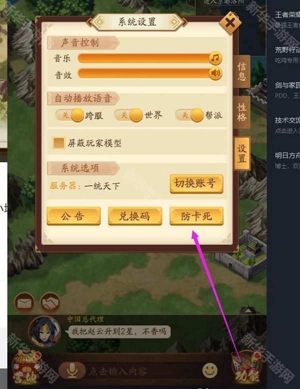 另外,在遇到卡死/没有出口的情况下,还可以进行”防卡死“操作,回到新手村。
