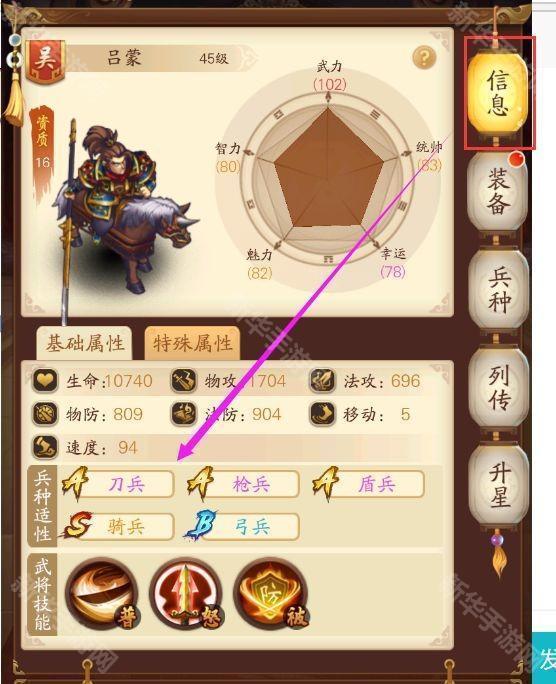 ⑧在角色的信息界面,如下图所示,可以看该名将的兵种适性,选择合适的兵种,能发挥更高的战斗力。