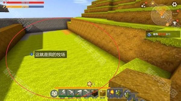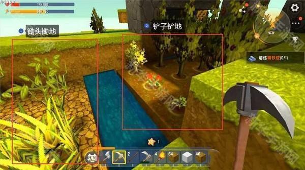 首先我们需要找到一处水源——因为在水源附近,农作物可以得到更好的滋养。接下来就在水源的两侧进行两种截然不同的处理方式:锄地与铲地。因为在《迷你世界》中,农作物与花树草也有着本质的区别:农作物只能种在用锄头锄过的地上;而类似树苗与鲜花这样的种植物,就只能被种在用铲子铲过的土坑里。