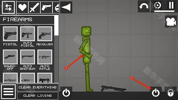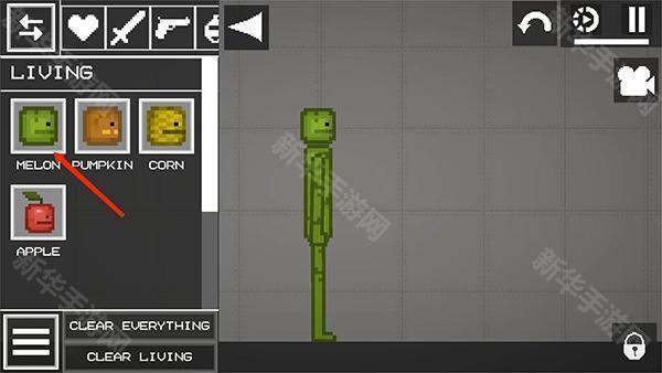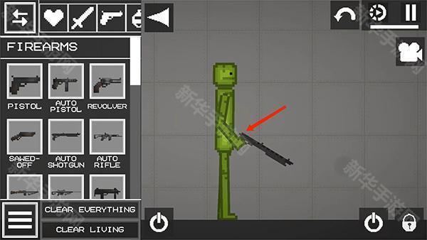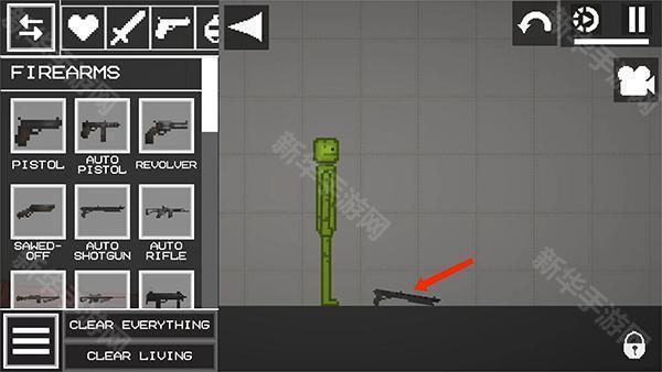 5、如图,可看到西瓜人物手里已经拿着枪了,点击按钮可以进行射击,以上就是让人物拿枪的教程了。