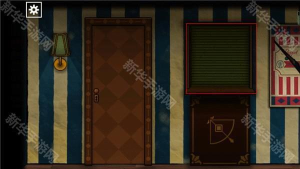 来到外面有着木偶戏海报这个位置,使用镜片对墙上的海报使用,在海报后面可以获得提示,进入到之前进行选牌游戏的地方,点击后面的幕布