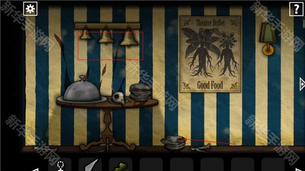 返回到之前通过铃铛拿到眼球的地方,在这里如图点击213122,接下来就可以在下面的餐盘当中拿到脑子。
