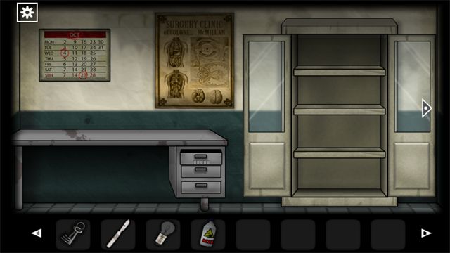 在第四个房间(医务室)醒来后,观察墙上的日历,发现标注为OCT的日期,推算得到密码为「10421」。接着输入密码打开下面的抽屉,获得一串钥匙。