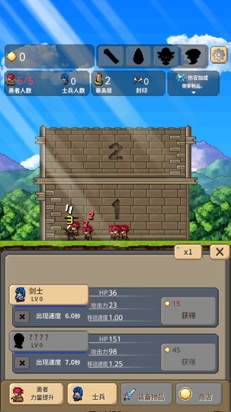 勇者之塔是一款像素角色扮演冒险游戏,游戏中玩家将操控勇者从第一层开始挑战充满魔物的高塔,玩家能够收集操控最多一百名勇者一起进行战斗。游戏中随着层数的提高,魔物的难度和数量都会层层增长