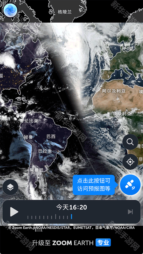 1、下载并安装Zoom Earth应用程序并打开它。点击卫星标志查看详细的天气图。您可以根据需要选择不同的天气,查看基本天气情况。