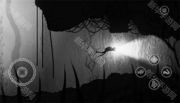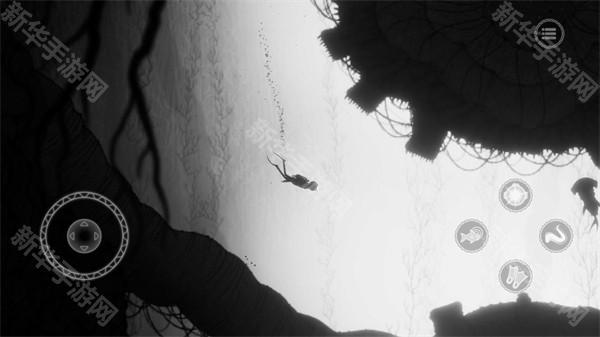 3、正式开始后左边控制角色的移动,右边触手图案的时占有技能,鱼图案的是使用对应海洋生物的能力,头盔图案的是探照灯,脚蹼图案是加速。