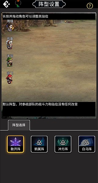设置不同的阵型可以为参战部队带来不同的属性加成,在战斗中若是己方剩余的参战队员少于三人,则阵型将会被敌方打破,失去相应的站位和属性加成效果。