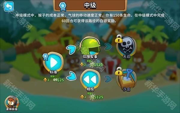 每个难度内有不同的条件分支,条件分支每个地图不同难度都不一样,每个选项都拥有各自的首通奖励。(例如下图中通关标准后解锁分支仅限军事,进图后只能放置英雄和军事猴)