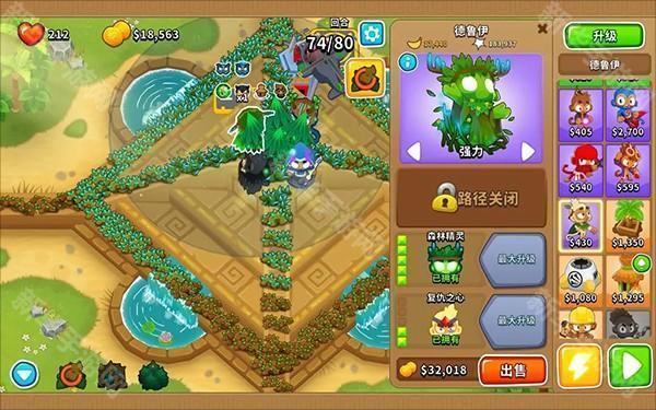 奥本格林福特对德鲁伊有特殊加成,并且等级10以后的“树木之墙”技能可以产生金币,森林精灵的丛林赏金技能同样可以产生金币,德鲁伊的其它两个分支效果也都不错,80回合后的无限模式再部署一些针对大型气球艇的猴子。