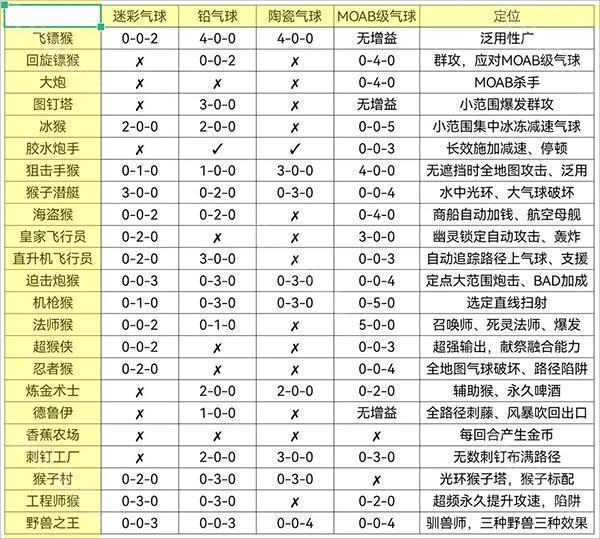 下表为每种猴子应对不同种类气球的技能加点推荐(0-0-2代表技能第三分支的第二个技能),以及每种猴子的定位(有问题评论区留言,我尽量发图解答)
