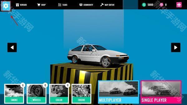 4、开始挑战,选择一辆喜欢的汽车,在左下角可以更换汽车的油烟、轮子、颜色、引擎等;