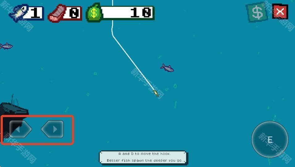 2、使用右下角的按键来控制鱼钩的方向。用鱼钩撞击一条鱼,对它造成伤害,伤害足够后将它钓上来。