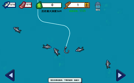 3、升级完毕,我们可以去钓鱼了,我们可以左右移动,让鱼钩钩住各种极品大鱼。
