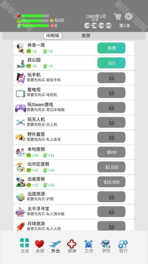 (一定要注意自己的健康值,工作还有学习的时候会耗费健康值,外出可以加心情值)