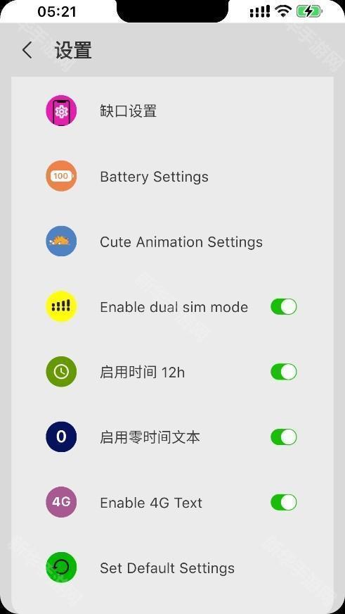 3、包含状态设置、缺口设置、电池样式、时间样式等都可以根据喜好来设定,也可以选择set default settings恢复默认设定。