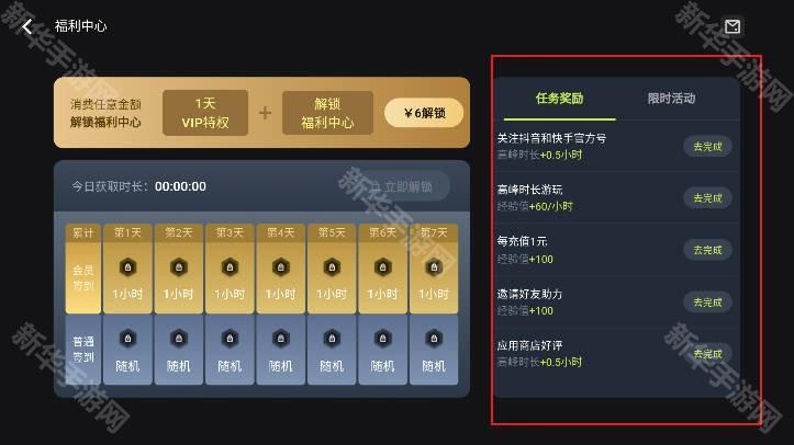 2、通过完成右侧的任务或者签到可以免费获得时长
