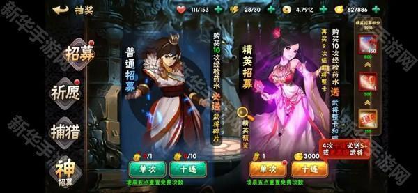 精英招募:想要获得更高等级(B-SSS级)的武将,就要在精英招募中购买高级经验药水啦!每招募10次必得到一个武将哦(注意:有机会直接招募到SSS武将)~精英招募积分也可直接领取SS武将一枚