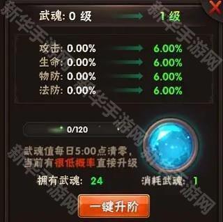 武魂等级提升时,武将基础属性成百分比的上涨。游戏前期这种提升方式对战力影响较大。