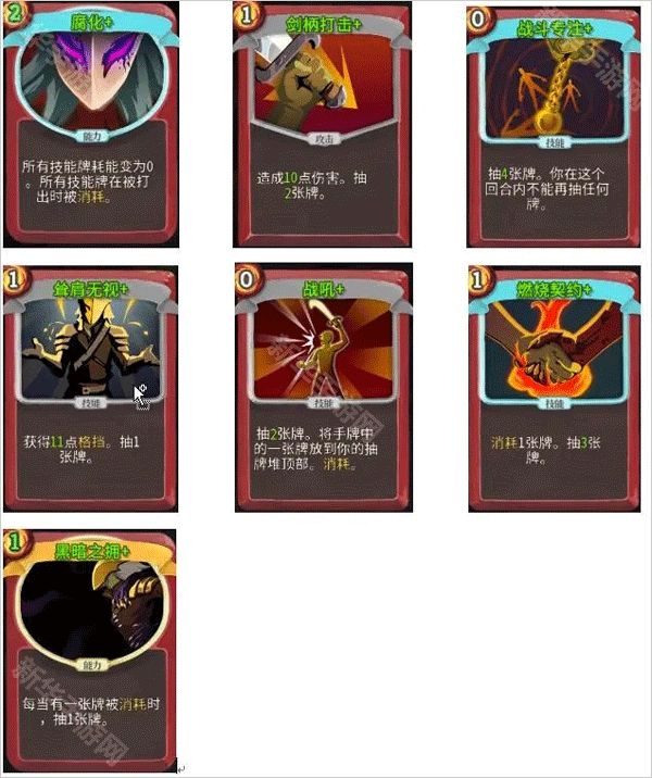 灼热攻击:前期选择好之后,尽量选择篝火多的路线,这张卡可以无限强化。强化次数越多,攻击越高,是杀戮尖塔中单卡输出最高的牌。