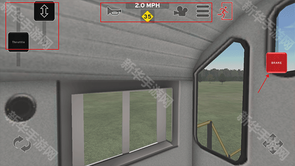 5、拉动右上角的红色拉杆可以控制火车行驶起来,点击左上方的拉杆可以控制火车速度、倒车以及驾驶视角,红色人型键为下车。