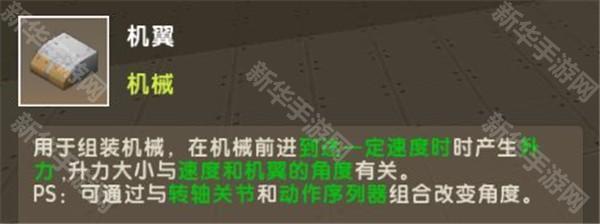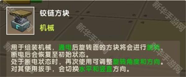 铰链方块只能用在机械中才会生效,通电后旋转面的方块会进行旋转。装在铰链方块旋转面的方块会被带动旋转,在飞行载具中,铰链方块可以用来带动机翼或者尾翼旋转,同时,用扳手点击铰链方块可以切换旋转方向。