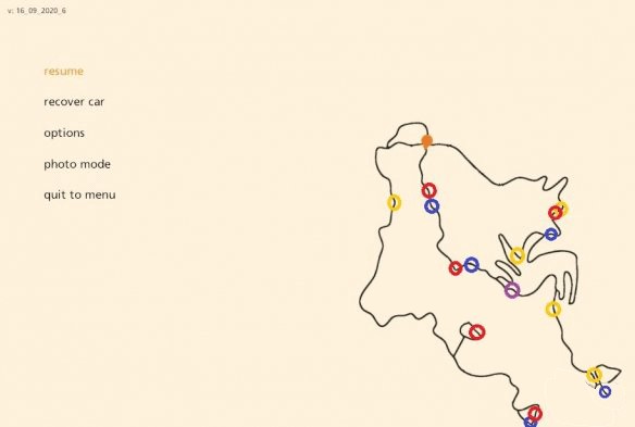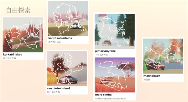 游戏分职业生涯、计时赛、自定义赛事,当然我们也可以进行在线活动,有点类似迷你公路里面的每周每日挑战,也可以自由探索不同的国家赛道和自定义你想要的时间段:早上、下午、夕阳、下雨、夜晚、雾天。而这些天气就会对实际的赛道风景线有不同的效果。而不同的国家赛道需要我们解锁,解锁的条件就是完成上一个国家赛道的收集字幕,录音带等等任务。可以说自由探索是开着赛车去旅行,边欣赏风景,边收集物品,解锁下一个城市!