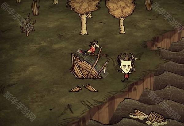 2、进入饥荒巨人国,然后在地图边缘上寻找沉船,沉船的特征是一半在岸上,一半是卡海里,船杆上停着一只戴海盗帽的红色鹦鹉。
