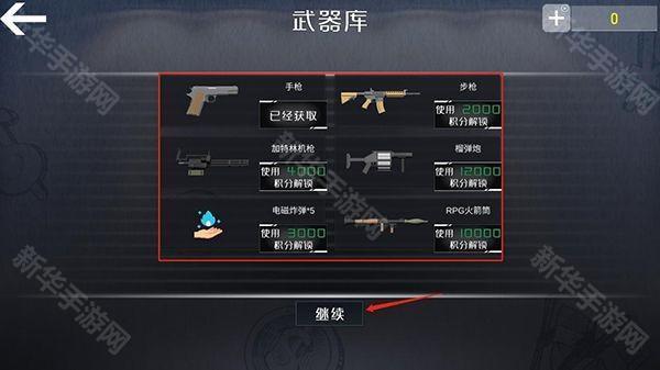 2、在武器库中选择你的武器,点击继续;