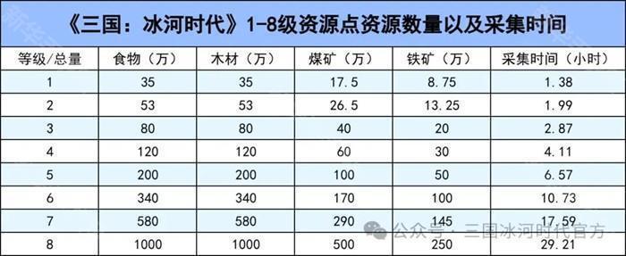 1. 前期准备与基础建设(1)资源积累食物、木材、煤矿、铁矿是四大基本资源,通过完成任务、采集资源点和日常活动获得;这些基础资源升级时,一般比例是4:4:2:1,在采集资源的时候也需要注意合理采集,避免某一项资源过于缺少。以下为基础资源采集需要时间,不同主公所叠加buff不同,最终采集时间会有所变化。