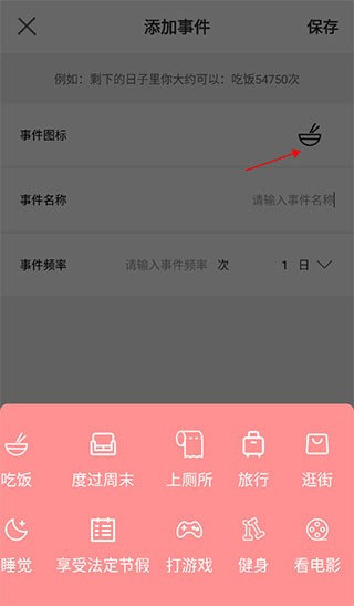 7、选择吃饭、健身、睡觉以及看电影等事件图标,设置事件名称和提醒频率,点击保存就可以啦。