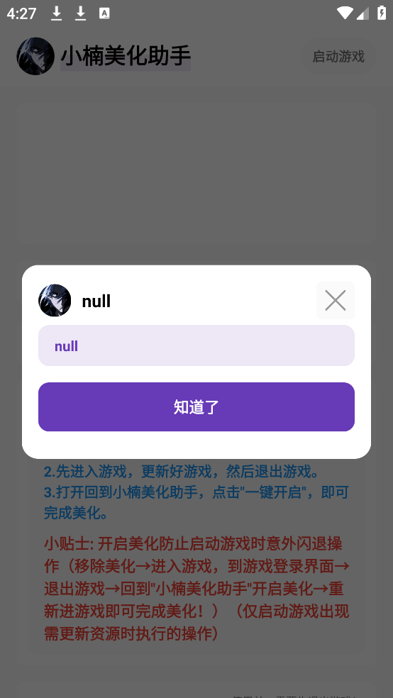 ②开启美化防止启动游戏时意外闪退操作(移除美化-进入游戏,到游戏登录界面-退出游戏-回到"小丑美化助